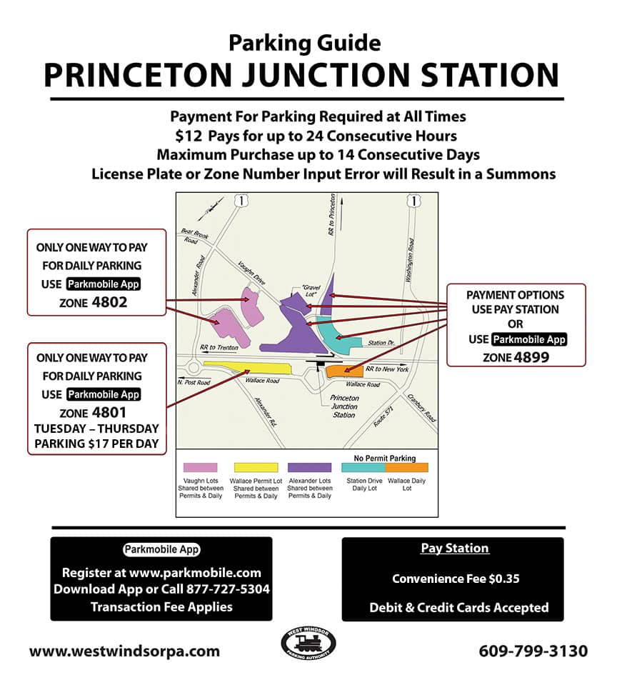Owned by NJ TRANSIT, these lots are for daily parkers and priced at $12 for a single stay of up to 24 hours to a maximum of 14 consecutive days. Payment is required promptly after parking on all days and at all times at any of 11 pay stations – simple prompts will guide you through the few steps required to “pay-by-plate” with credit/debit cards only. Payment can also be made through the Parkmobile App Zone 4899 which involves a convenience fee of $1.75 per transaction.